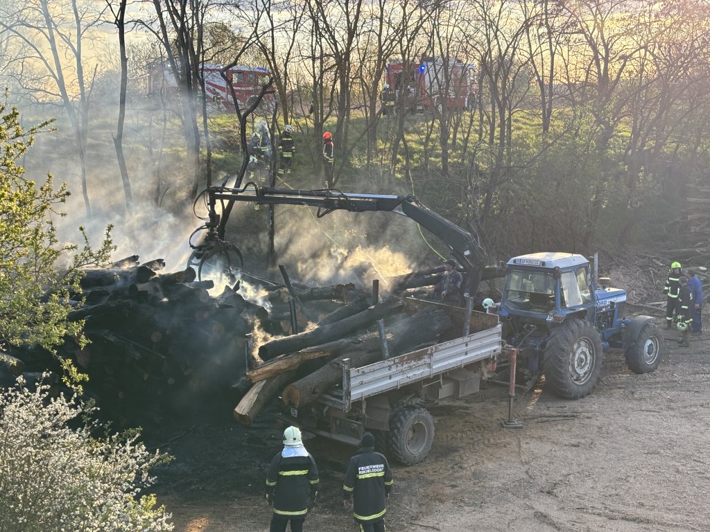 Zur Sicherstellung der Wasserversorgung wurde ein Tankpendelverkehr eingerichtet. Mithilfe eines Rückewagens konnte der Holzstapel auseinandergeräumt und so effizient abgelöscht werden. Nach umfangreichen Nachlöscharbeiten wurde eine Brandwache eingerichtet, um mögliche Glutnester zu kontrollieren.