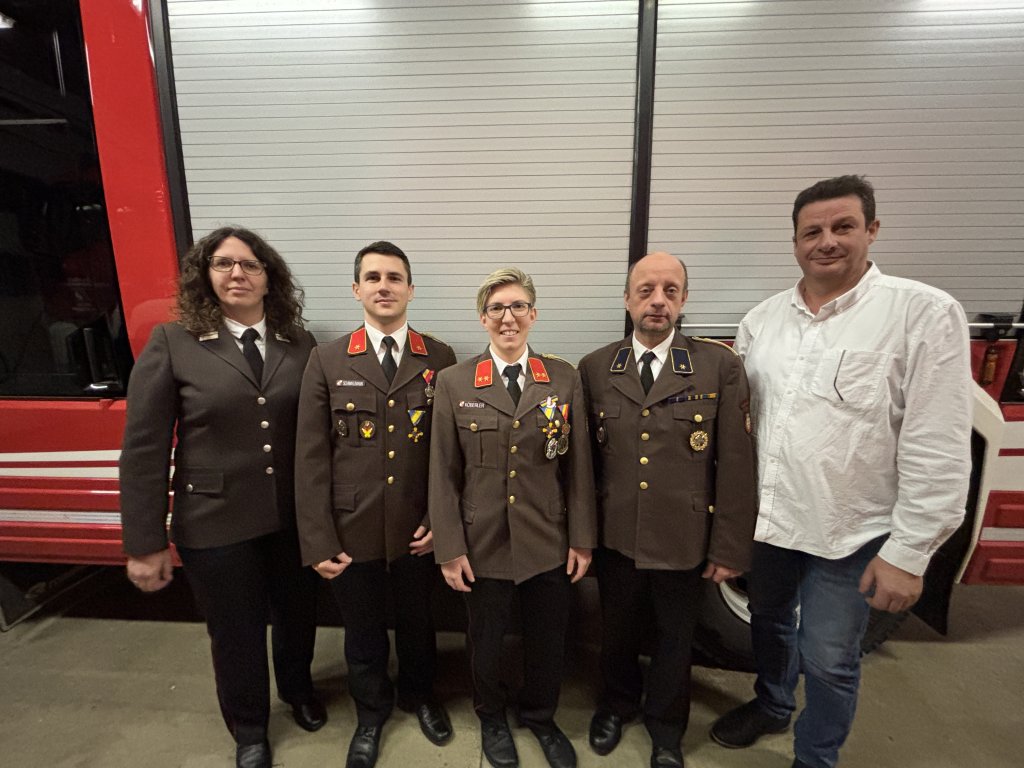 Foto (v.l.n.r.): Bgmin. Mag. Marina Kargl , Kdt-Stv. Markus Schwarzmann, Kommandant Nina Köberler, V Alfred Asimus, Vize-Bgm. Hubert Fembek