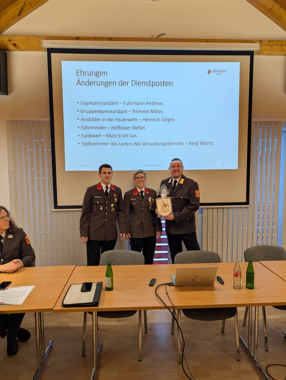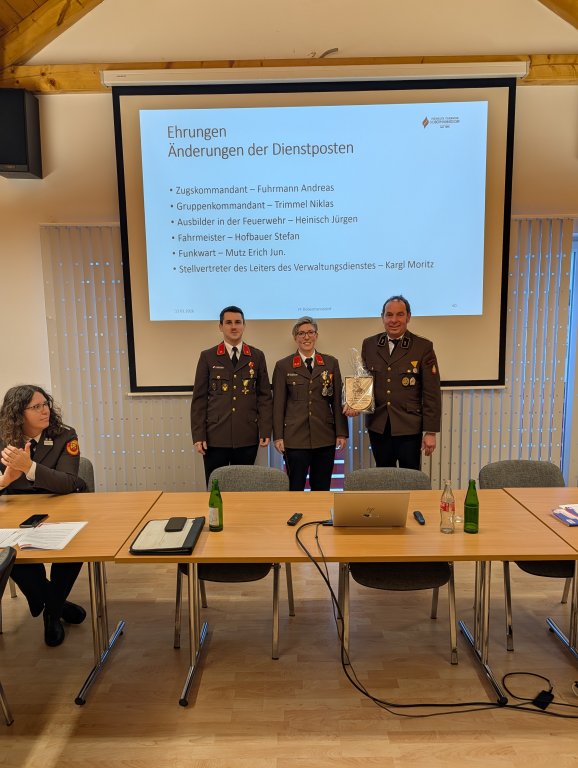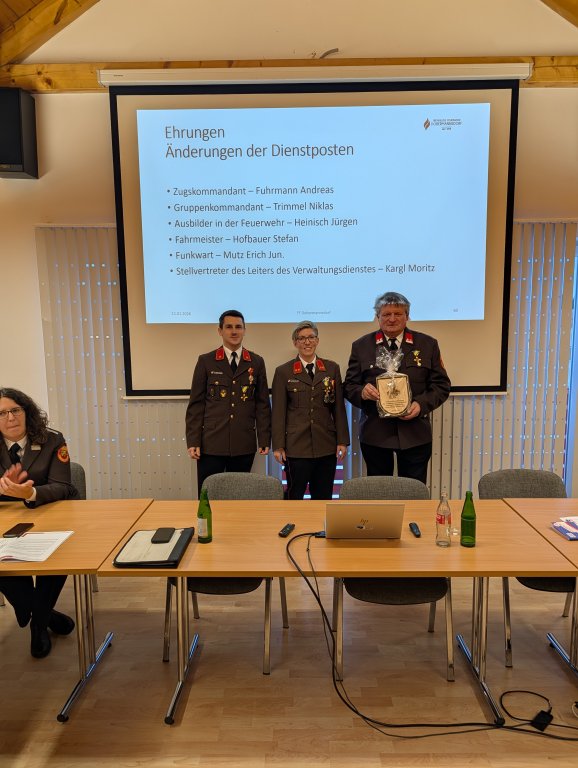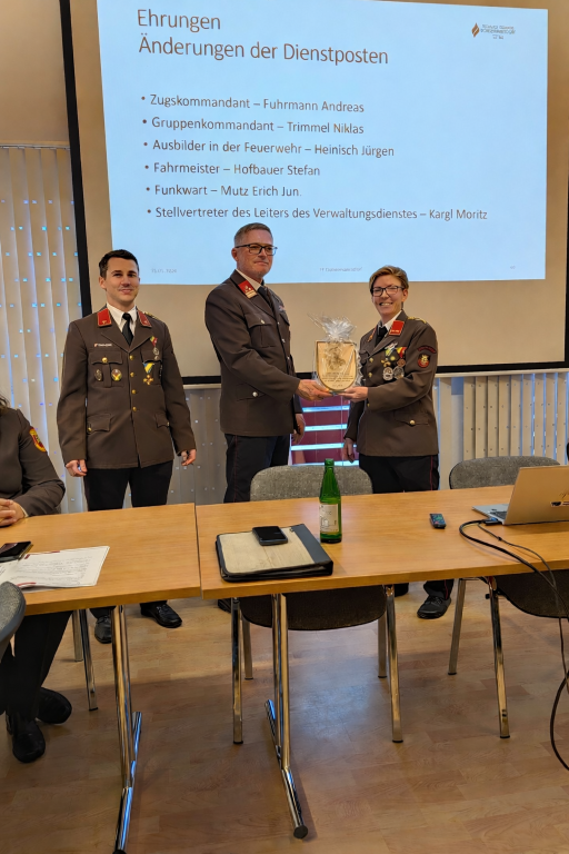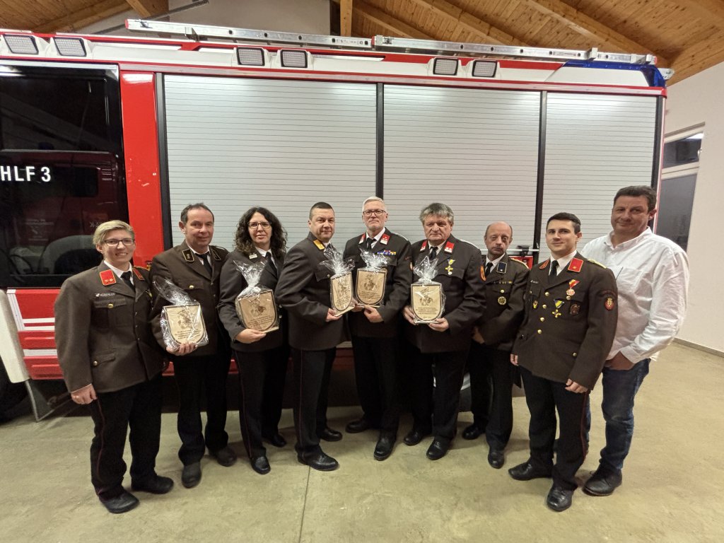 Wegen personeller Veränderungen in unterschiedlichen Chargen- und Sachbearbeiterfunktionen bedankte sich das neu gewählte Kommando bei den bisherigen Kameradinnen und Kameraden, die diese Positionen über viele Jahre hinweg innehatten. Ein Präsent, als Zeichen der Anerkennung erhielten
