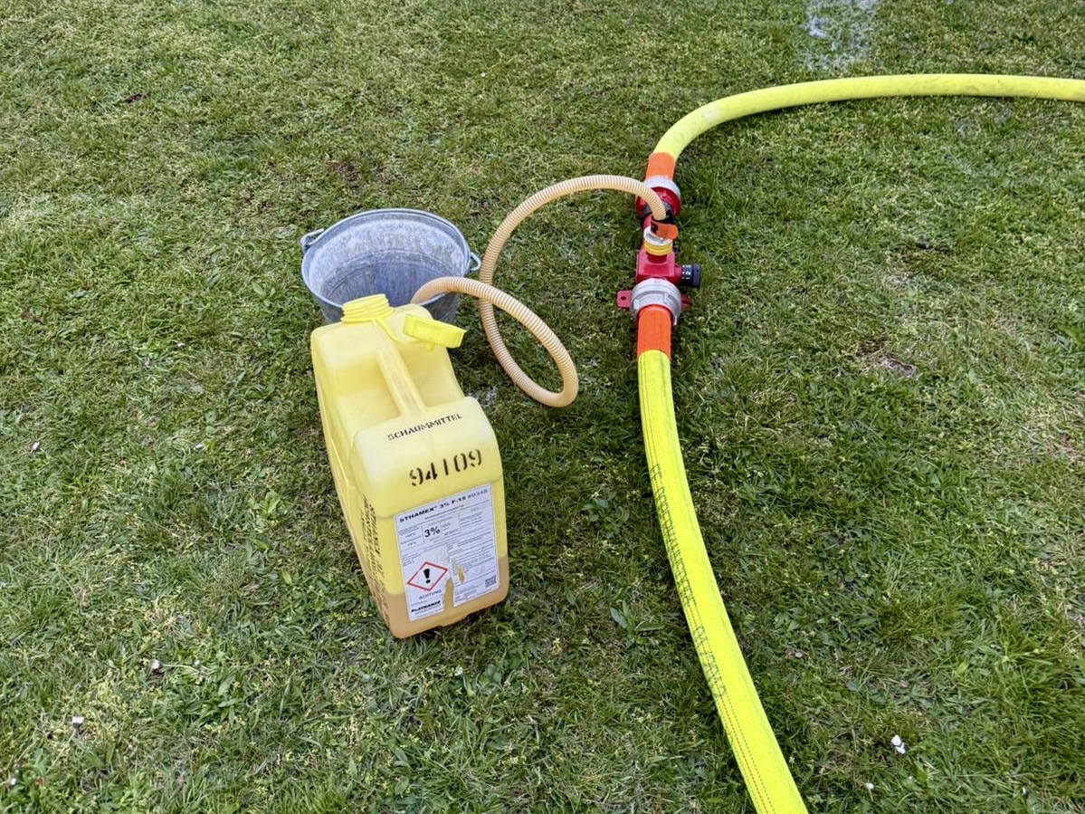 Dabei wurde ein Schaumangriff sowohl direkt aus dem HLF als auch unter Verwendung eines Zumischers durchgeführt.