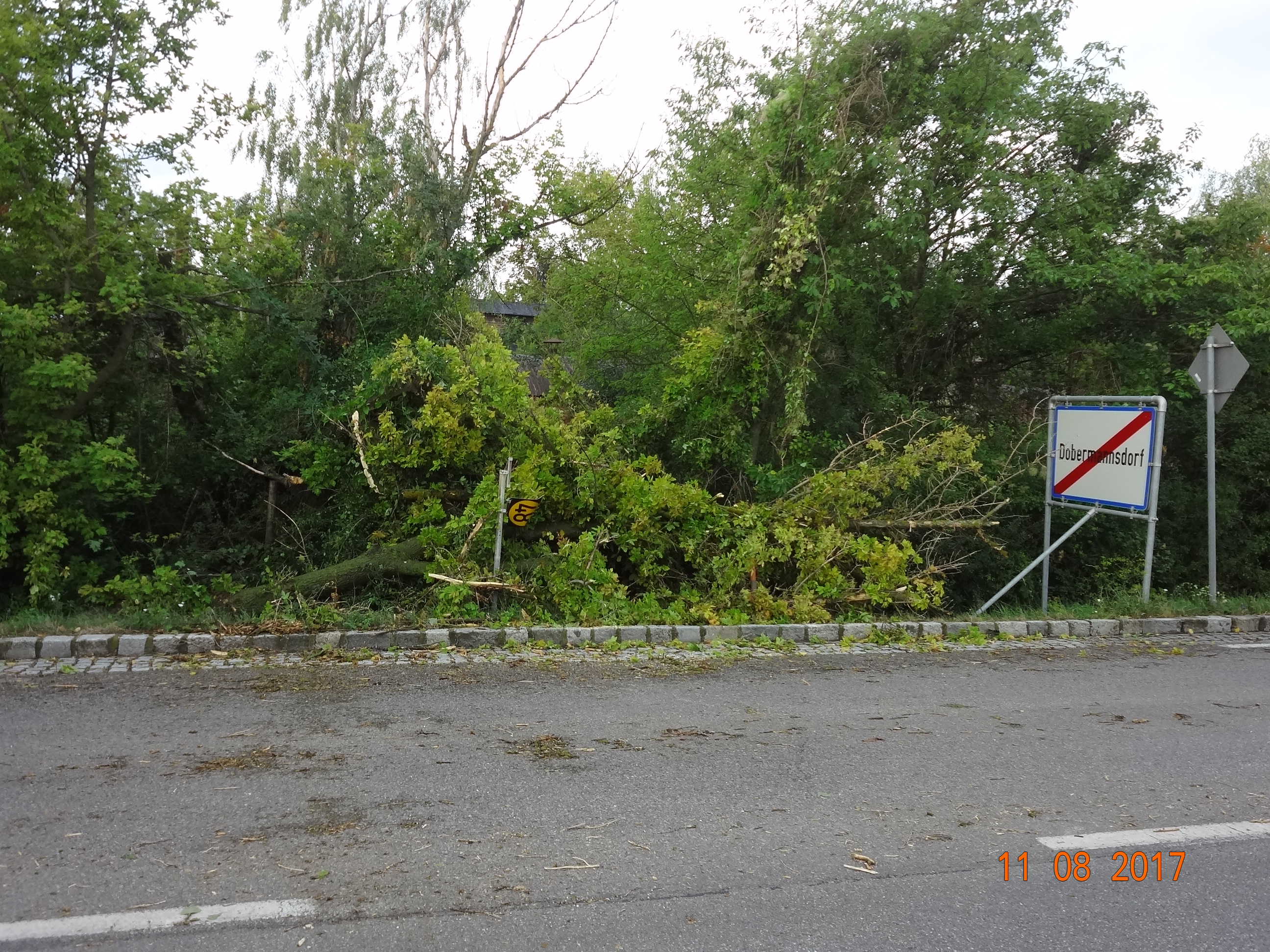Zu mehreren Sturmschäden wurde die FF Dobermannsdorf spätabends, am Donnerstag den 10. August, gerufen. Aufgrund heftiger Unwetter wurden Bäume umgerissen, sowie größere Äste von Bäumen gebrochen. Mittels Motorkettensäge wurde das Geäst freigeschnitten und die Fahrbahn anschließend gesäubert. Ebenso musste ein auf ein Dach gestürzter Baum mittels Kran abgetragen werden.