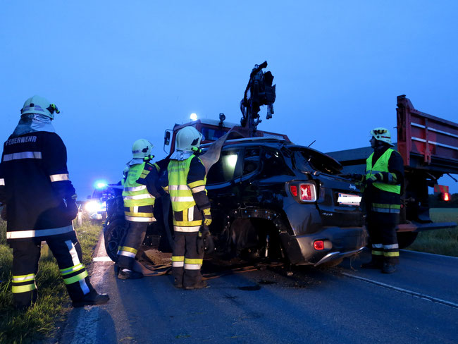 Mit Körperkraft wurde der Unfallwagen wieder auf die drei verbliebenen Räder gestellt, eines war durch die Wucht des Aufpralls abgerissen worden, mittels Kran der FF-Hohenau verluden die Florianis den Wagen und reinigten die Straße. Für die Dauer des Einsatzes blieb diese gesperrt.